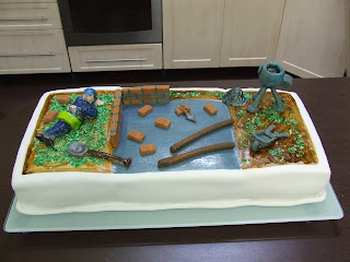 Házavató bulira készítettem ezt a hatalmas tortát, amely belül 3 kisebb tortát rejt magában: joghurtos szedertortát, tejszínes csokitortát és citromtortát főzött krémmel. A dekoráció az építkezési munkákból kiragadott pillanatkép :-)